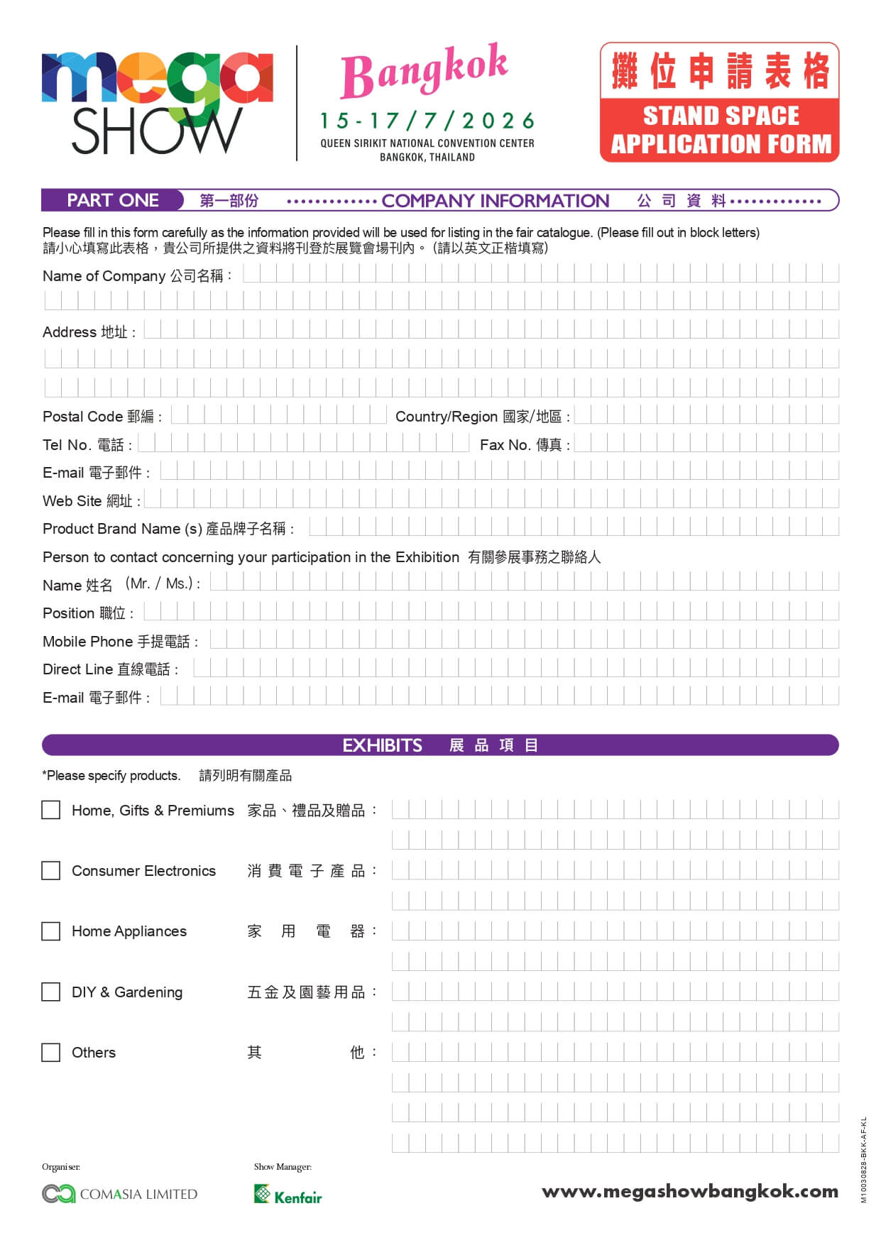 Apply for exhibition space at MEGA SHOW Bangkok 2026 by submitting your company and product details.